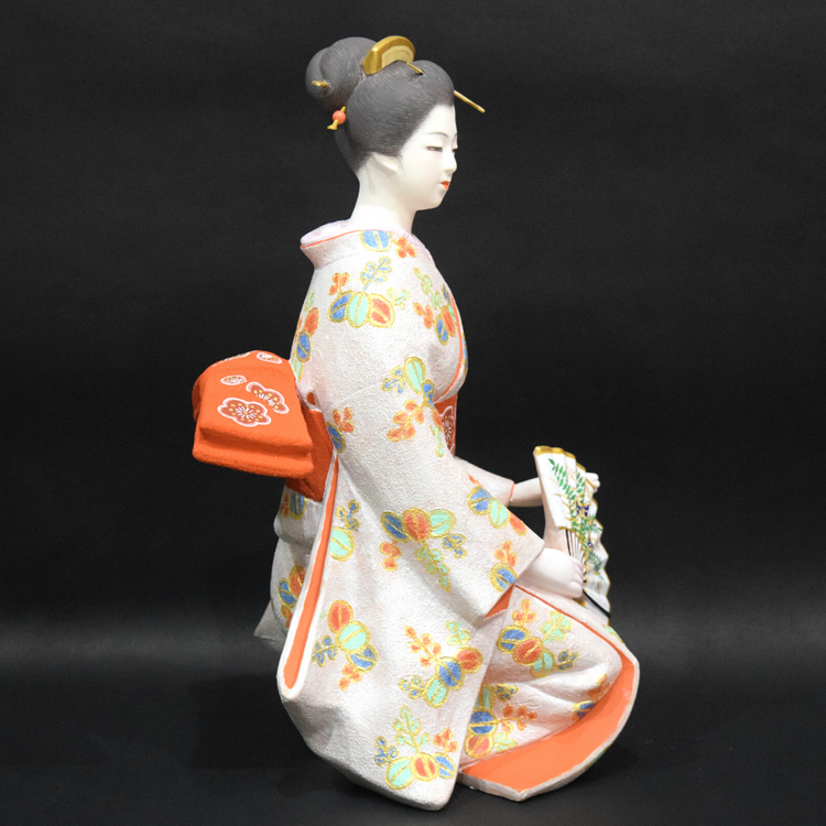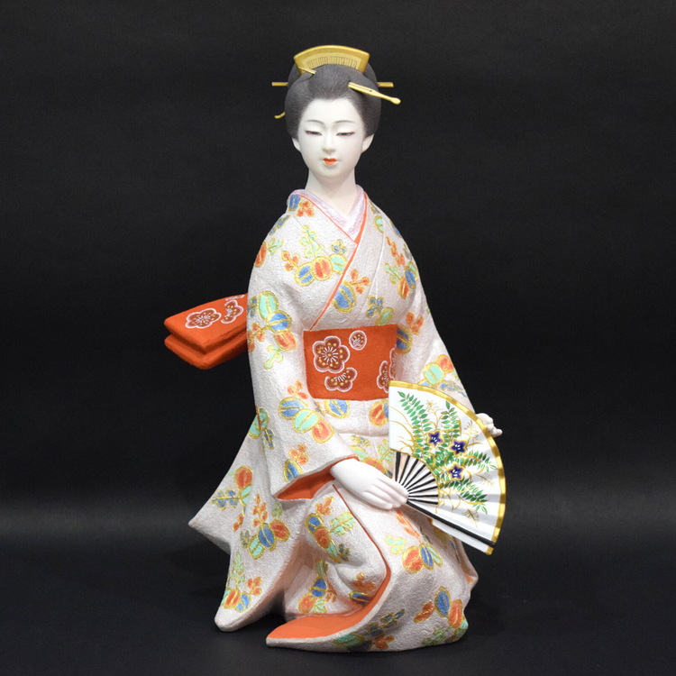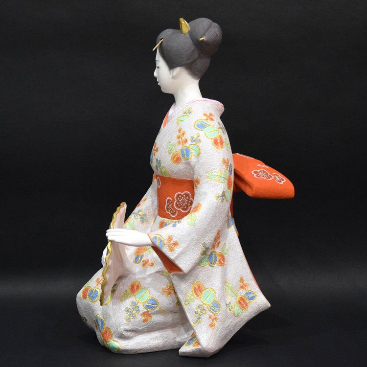 【Graceful dance】A half-sitting woman with a fan outstretched seems as if she is about to start dancing mai, creating a tranquil yet gorgeous atmosphere in this excellent work of Hakata doll art.