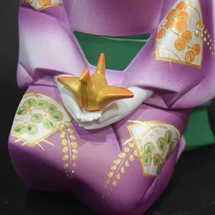 【Celebrating the New Spring】A neat young girl with plaited hair is sitting on the floor holding a paper crane. The innocent expression on her face is filled with longing for the coming spring. The calm purple tones of this work celebrate the New Spring.